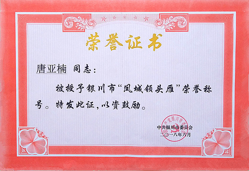 唐亞楠被授予銀川市“鳳城領頭雁”榮譽稱號