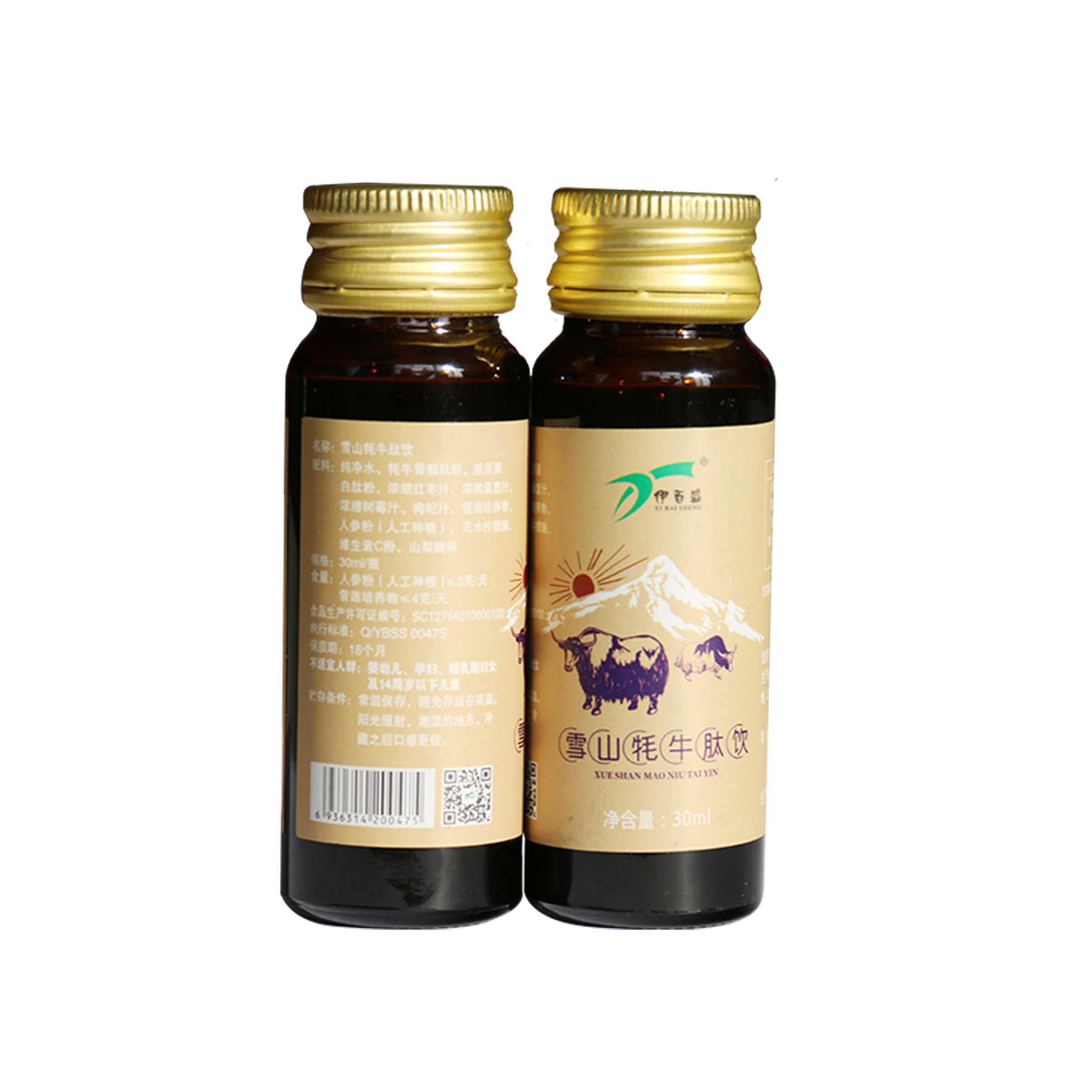 名稱:雪山牦牛肽飲配料:純凈水、牦牛骨髓肽粉、膠原蛋白肽粉、濃縮紅棗汁、濃縮桑葚汁、濃縮樹莓汁、枸杞汁、雪蓮(培養物)果粉、人參(人工種植)粉、無水檸檬酸、維生素C粉、山梨酸鉀規格:30ml瓶食品生產許可證號:SC12764010600100執行標準:QYBSS 0047S保質期:18個月貯存條件:常溫保存,避免存放在高溫,陽光照射,潮濕的地方,冷藏之后口感更佳。注意事項:本品如有少許果肉沉淀,屬