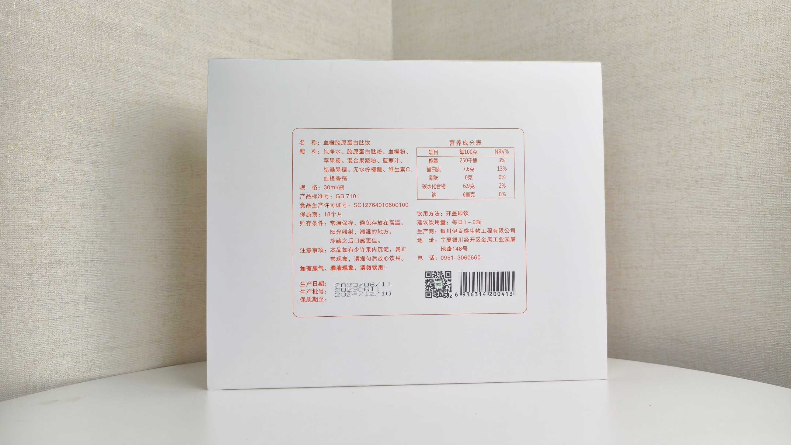 名稱:血橙γ-氨基丁酸膠原蛋白肽飲配 料:純凈水、膠原蛋白肽粉、血橙粉、蘋果粉、混合果蔬粉、菠蘿汁、結晶果糖、無水檸檬酸、維生素C、血橙香精規 格:30ml/瓶執行標準:GB 7101食品生產許可證號:SC12764010600100保質期:18個月貯存條件:常溫保存,避免存放在高溫,陽光照射,潮濕的地方,冷藏之后口感更佳。注意事項:本品如有少許果肉沉淀,屬正常現象,請搖勻后放心飲用。如有脹氣、漏